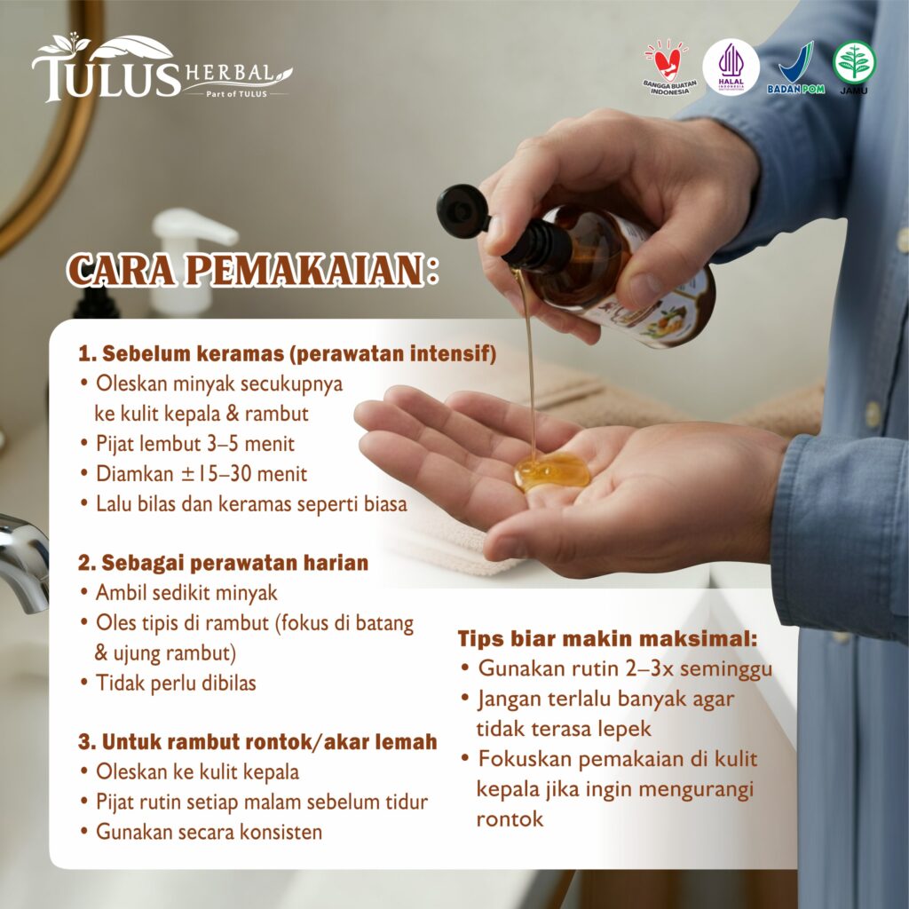 Oleskan minyak secukupnya ke kulit kepala dan rambut, pijat lembut selama 3–5 menit, diamkan 15–30 menit, lalu bilas dan keramas seperti biasa.